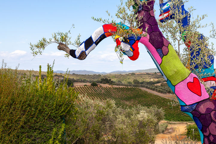 Nell’incantevole cornice di Capalbio, un territorio dove la passione per il vino si incrocia con l’arte l’Accademia di Aracne ha realizzato una delle sue ultime istallazioni. Vive le vin, un’opera che vuole omaggiare Niki de Saint Phalle e il suo affascinante e visionario Giardino dei Tarocchi. Traendo spunto dalla folgorante parabola creativa di questa artista poliedrica Vive le vin si ispira a un disegno di Niki de Saint Phalle del 1990 intitolato Vive l’Amour. Il risultato dell’istallazione è un ulivo robusto e secolare, ricoperto da forme esuberanti e colorate ognuna con un significato specifico. Dal tronco si districa una scacchiera dove il bianco e il nero si rincorrono in una lotta tra positivo e negativo che si conclude in una simmetria di colori scintillanti. Dedica a Niki de Saint Phalle e al suo piccolo eden, il Giardino dei Tarocchi, è il ramo dedicato alla figura del serpente metafora di trasformazione, rinascita e seduzione. Tra le forme che decorano l’albero c’è il sole con i suoi raggi che fa maturare l’uva, un frutto che grazie all’amore dell’uomo si trasforma in vino, infatti la forma del cuore ritorna anche in altri pannelli così come quella raggiante del sole. Il risultato finale dell’istallazione è un albero che ci consegna un'immagine di vita, feconda ed eterna e un messaggio: Vive le vin.